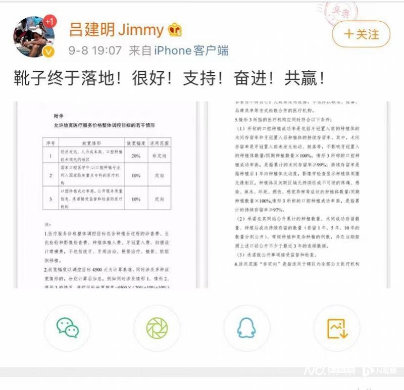 今年以來,因?yàn)榉N植牙集采的傳聞,通策醫(yī)療在資本市場(chǎng)的表現(xiàn)一直平平。在多次投資者關(guān)系活動(dòng)中,通策醫(yī)療反復(fù)多次對(duì)種植牙的集采進(jìn)行回應(yīng)。如今靴子落地,通策醫(yī)療董事長(zhǎng)昨天在社交平臺(tái)發(fā)出放寬條件截圖并評(píng)論:“很好!支持!奮進(jìn)!共贏!”