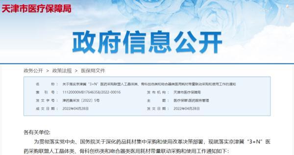 4月28日,天津市醫(yī)保局發(fā)布《關(guān)于落實(shí)京津冀“3+N”醫(yī)藥采購聯(lián)盟人工晶體類、骨科創(chuàng)傷類和吻合器類醫(yī)用耗材帶量聯(lián)動(dòng)采購和使用工作的通知》,通知對(duì)采購品種和約定采購量進(jìn)行規(guī)定,帶量采購結(jié)果將在一年周期內(nèi)執(zhí)行,醫(yī)療機(jī)構(gòu)需優(yōu)先使用中選產(chǎn)品。