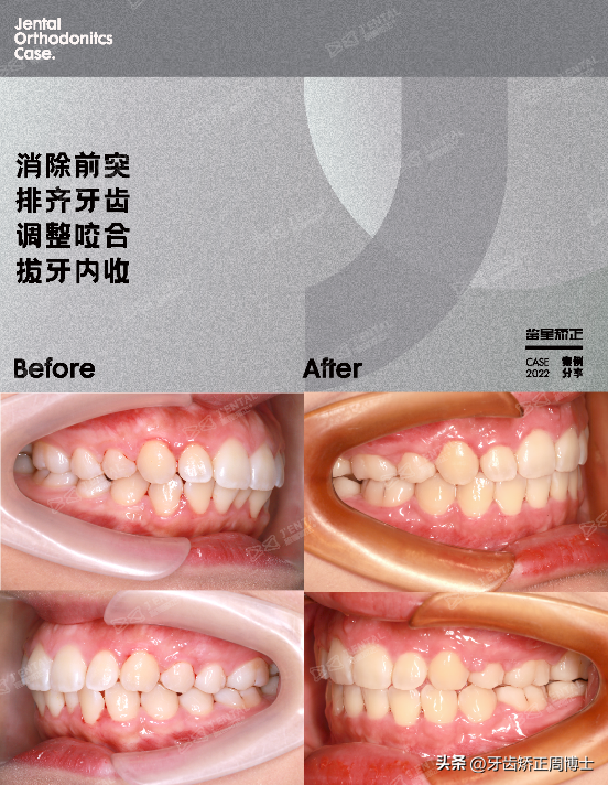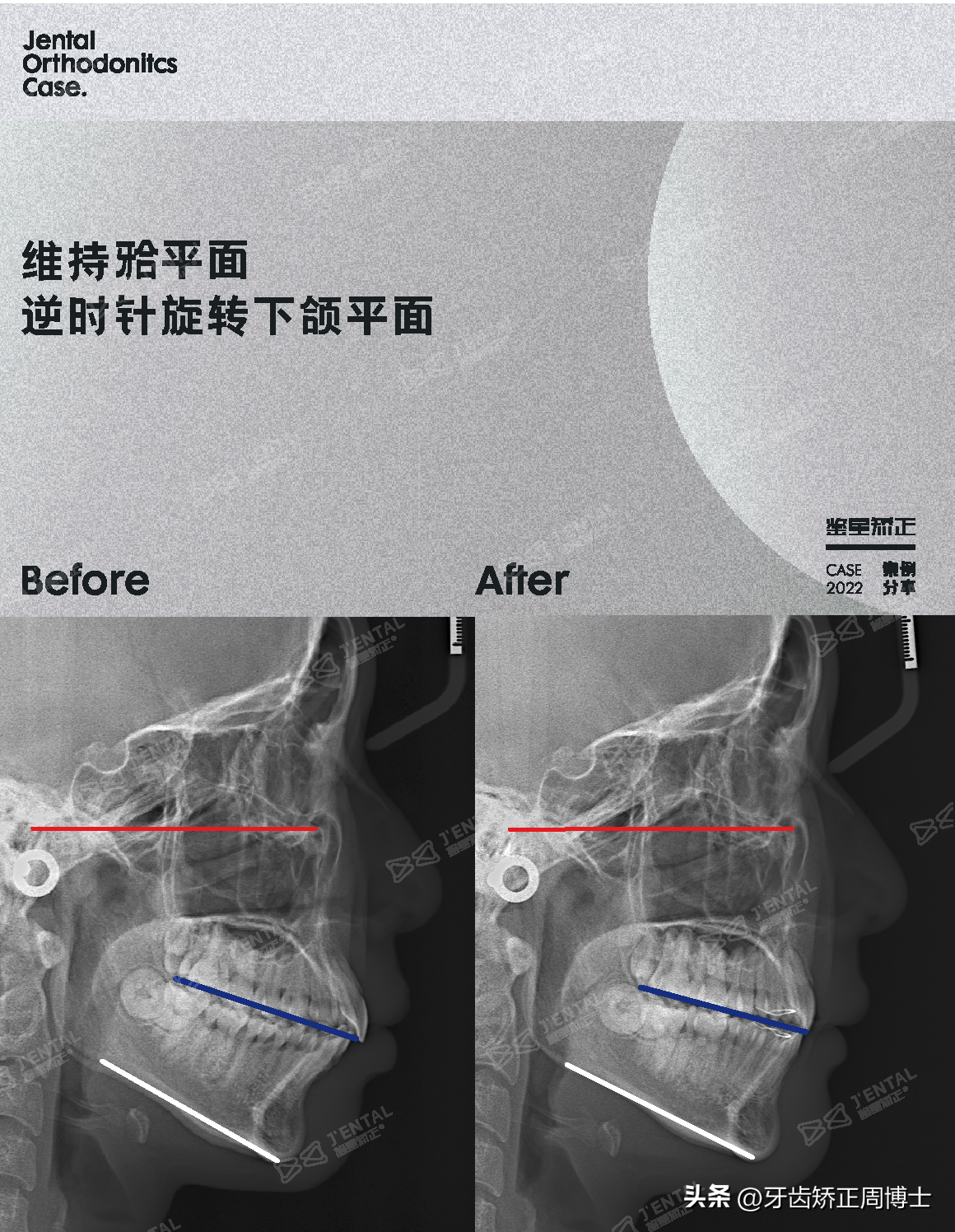正確的思路實際上是矯正牙齒,這樣骨性前突和下頜后縮可以一同得到改良。這也是我們典型的案例之一,想要解決前突后縮,就需要讓下巴逆旋,這樣前突解決的同時下巴也“旋”出來了,從側(cè)面看就是漂亮的直面型。