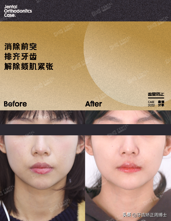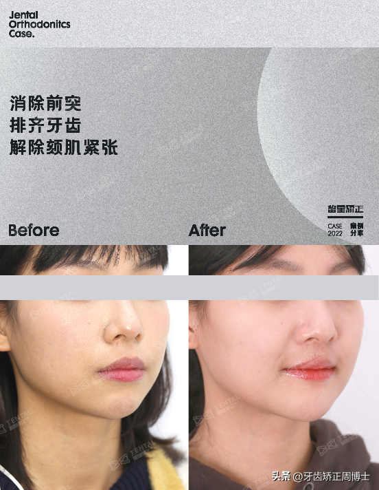 從后的對比圖可以看到她的面下三分之一的變化很大,口周肌肉得到放松之后,視覺看上去嘴唇變小了。突嘴內(nèi)收進去后,原先偏銳的鼻唇角變?yōu)閹缀踔苯牵W部也從后縮的狀態(tài)變化到擁有的頦唇溝,面型得到的改良。