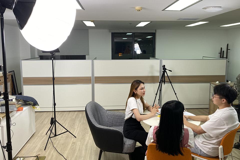 2021年9月11日,歐陽瑩瑩(左一)與同事討論短視頻拍攝腳本。 (南方周末記者 劉怡仙/圖)