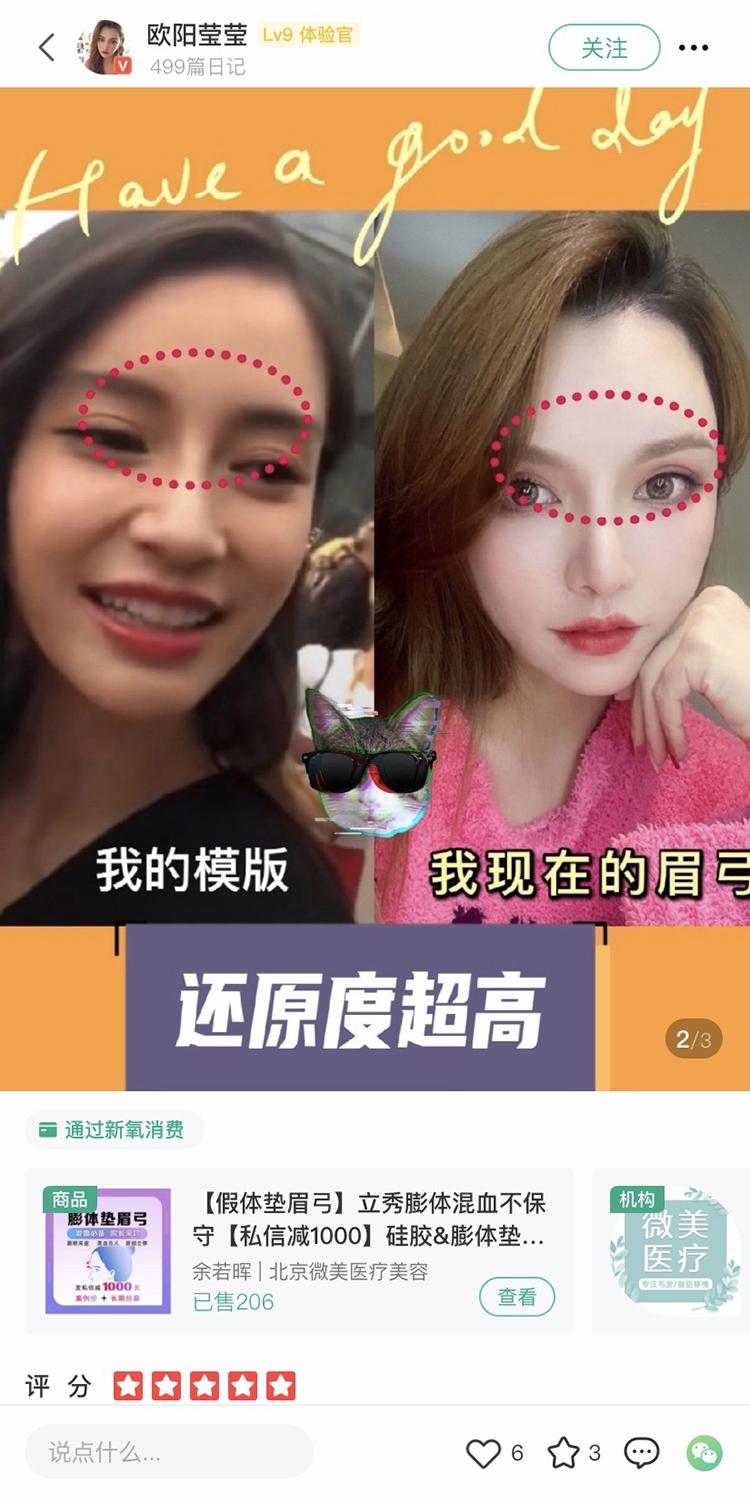 “外科手術(shù)就像開盲盒,拆線以前不知道是什么樣”,她做了一次手術(shù),但用了三次修復(fù),形成自己滿意的鼻形;她的兩頰曾進(jìn)行脂肪填充,導(dǎo)致面部腫脹,坑坑洼洼。她把每項(xiàng)整容經(jīng)歷寫成日記,發(fā)布在新興的醫(yī)美平臺上,“幫助姐妹們在變美路上避坑”,同時也給醫(yī)美產(chǎn)品帶貨——整容逐步成為她的營生。
