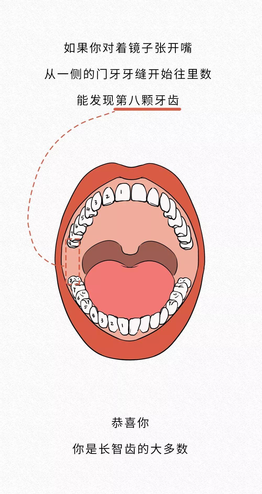 在原始時(shí)期,智齒還是很有用的。但后來我們吃的越來越精細(xì),派不上用場的智齒就開始退化消失,不過也不是所有人都不會(huì)有智齒,有的人還是會(huì)長,數(shù)量也有多有少。一般在16-30歲的時(shí)候,智齒可能就會(huì)趁你不注意,偷偷從牙槽后面冒出來,如果你對著鏡子張開嘴,從門牙牙縫沿一側(cè)的門牙往里數(shù),能發(fā)現(xiàn)第八顆牙齒。那恭喜你,你就是被智齒選中的那個(gè)幸運(yùn)鵝。