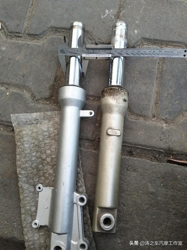 記得以前在修摩托車的時候,有一款小帥哥的踏板車,它的前避震器上的止動塊就很長,再去看看我的庫存配件里有沒有?還好翻來翻去還找到了一副,原車的前避震器減震筒直徑為31毫米,小帥哥的前避震器減震筒的直徑也是為31毫米,加上的止動塊又很長,剛好可以使用,作為調整前輪居中的有配件。