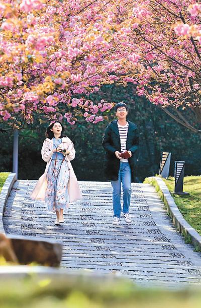 游人在江西省九江市濂溪區(qū)南山公園的櫻花園內賞花。 張海巖攝(新華社發(fā))