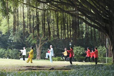 市民在廣西壯族自治區(qū)南寧市南湖邊的芳草綠樹間健身。 新華社記者 陸波岸攝