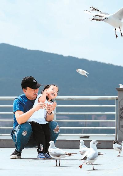 游人在云南省昆明市海埂大壩觀賞紅嘴鷗。 新華社記者 王冠森攝