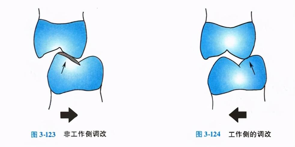 用咬合紙檢查早接觸的位置。在調(diào)節(jié)非工作側(cè)早接觸時,出現(xiàn)在上頜舌尖頰斜面的早接觸點(diǎn),或出現(xiàn)在下頜頰尖舌斜面的早接觸點(diǎn)應(yīng)被消除(圖3-123)。