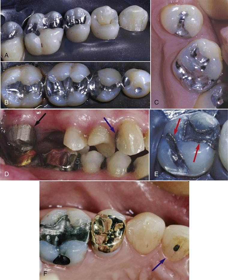 (3)邊緣適合性(marginaladaptation):修復(fù)體的鄰接檢查合適后,在修復(fù)體徹底就位的情況下仔細(xì)觀察冠邊緣的情況。合適的冠邊緣不應(yīng)存在過長(over-extended)、過短(under-ex—tended)、過厚以及與頸緣之間有間隙的情況(圖3—119)。冠邊緣與頸緣之間的間隙大于50p~m的狀態(tài)通常被認(rèn)為是間隙過大,這樣大的間隙意味著探針的尖可以探入冠邊緣與頸緣之間。位于齦下的冠邊緣的適合度很難檢查,而齦下不適合的冠邊緣對牙齦的健康為有害。