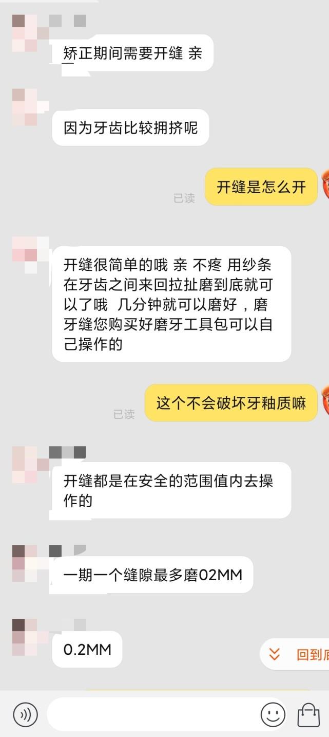 有商家打出“您只需咬個牙印”的廣告語,在河南商報記者根據(jù)商家要求提交牙齒情況自拍照之后,客服回復:“您的牙齒矯正期間需要開縫,用紗條在牙齒之間來回拉扯到底,幾分鐘就好了”,隨后,客服推薦記者購買磨牙工具自己操作。