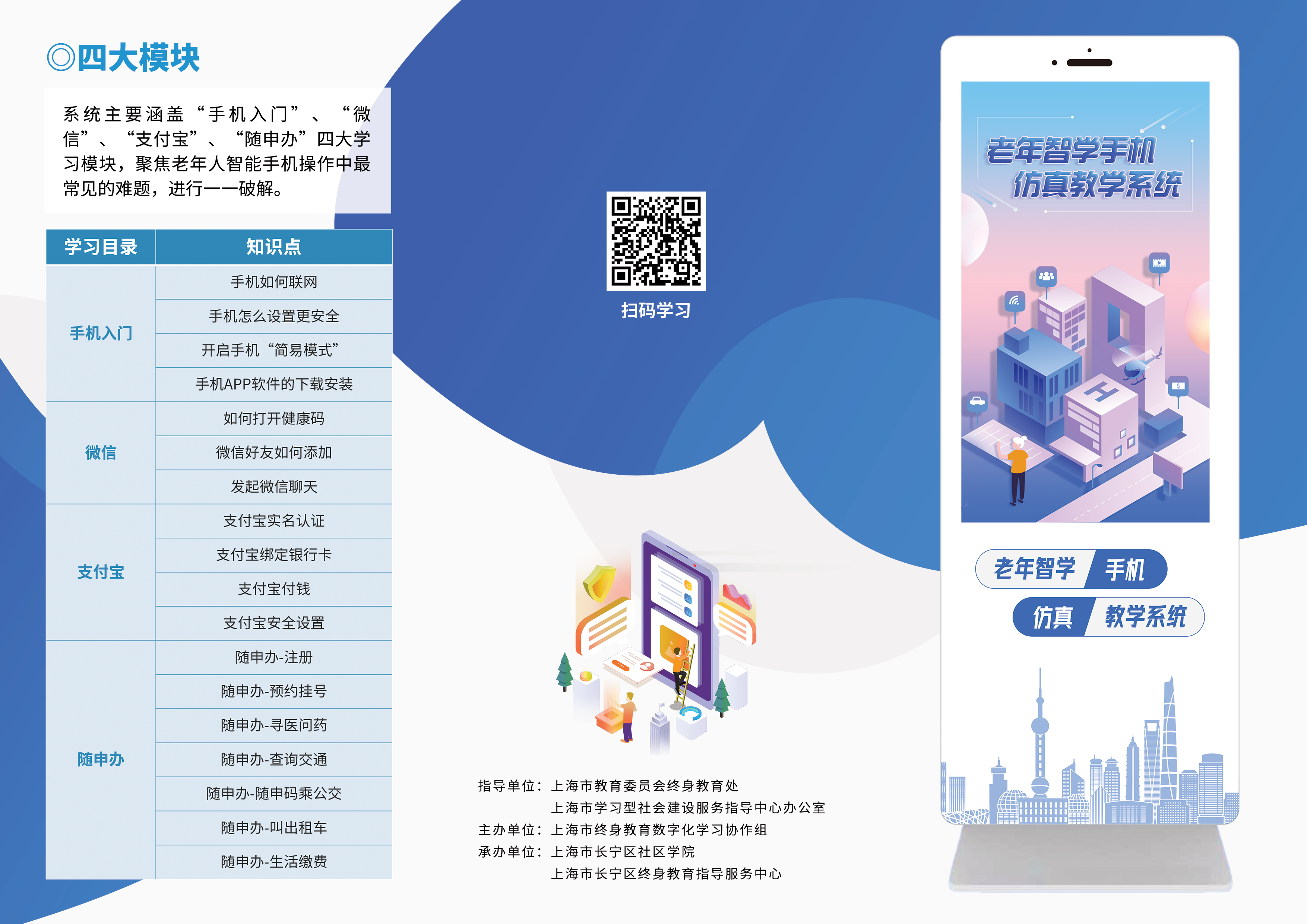澎湃新聞(www.thepaper.cn)記者從上海市教委了解到,系統(tǒng)適配手機(jī)端與平板端,安卓系統(tǒng)與蘋果系統(tǒng),包含“智能手機(jī)隨心學(xué)”、“老年智能生活”兩大版塊,內(nèi)容涵蓋“手機(jī)入門”“微信”“支付寶”“隨申辦”4個(gè)模塊18項(xiàng)內(nèi)容的智能手機(jī)常用功能學(xué)習(xí)內(nèi)容。