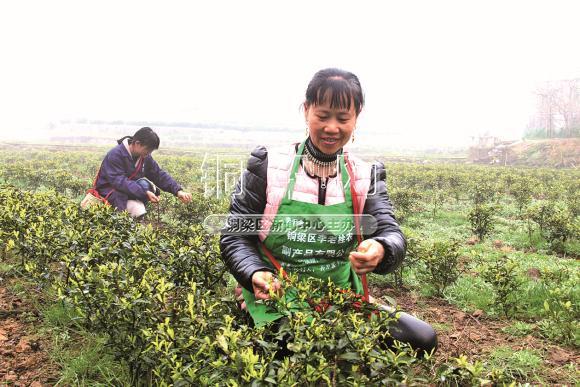 本網訊 3月13日上午,記者在安溪鎮(zhèn)譚洪村的一片茶地里看到,在不到膝蓋高的茶樹尖上,長出了金黃色的嫩芽,村民們正在采摘這些嫩芽。“這是試種的新品種茶,由于茶葉品質好,價值高,加之呈金黃色,所以名字叫‘黃金茶’?!弊T洪茶葉專業(yè)合作社社長王發(fā)明興奮地說,從今年試產的情況看,安溪引種黃金茶已經獲得成功,填補了銅梁本地無高端茶的空白。