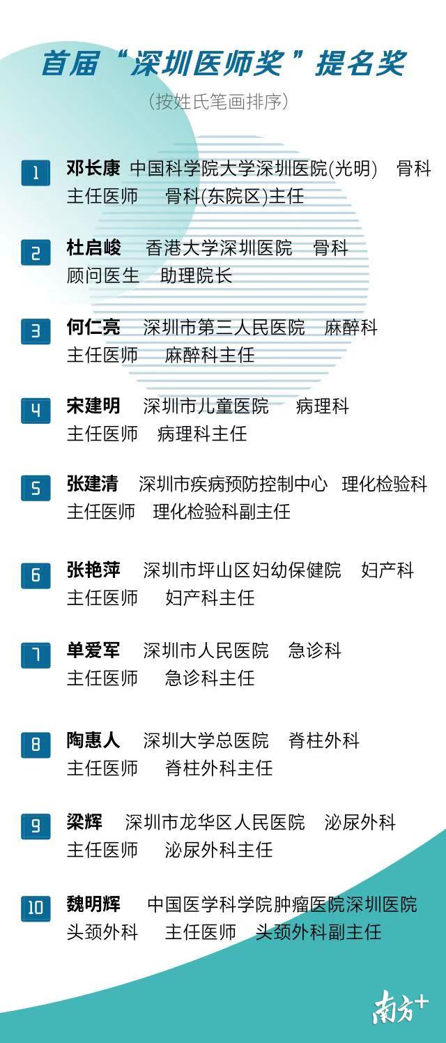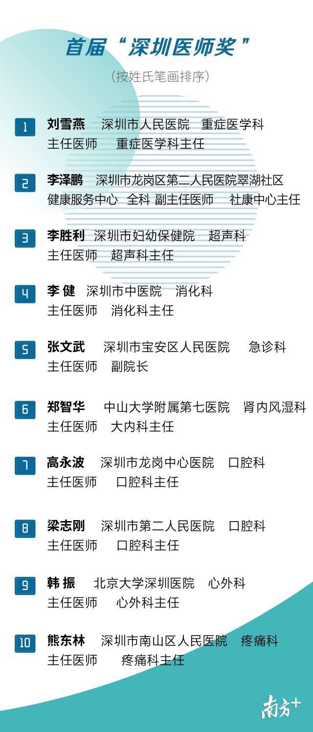 為了尋找2019年度的醫(yī)師,深圳舉辦了首屆“醫(yī)師獎”評選活動。經(jīng)過初審、網(wǎng)絡投票、專家評審和評議、公示后,20位的醫(yī)生脫穎而出,劉雪燕醫(yī)生等10人獲首屆“深圳醫(yī)師獎”,鄧長康醫(yī)生等10人獲首屆“深圳醫(yī)師獎”提名獎。