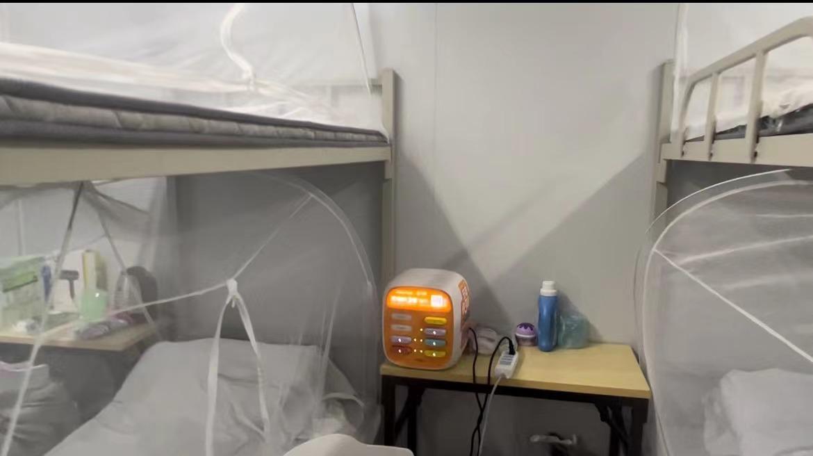 “這就是我們的樣板間,后面的房間也會(huì)按照此配制?!弊哌M(jìn)該項(xiàng)目?jī)?nèi)目前已布置好的房間內(nèi),床鋪、桌子、衛(wèi)生間、風(fēng)扇、水桶,各類常用生活物品一應(yīng)俱全。據(jù)了解,這里每房間分五人間、六人間兩種,每個(gè)床位標(biāo)備標(biāo)準(zhǔn)成人上下鋪床、桌椅等二十余種生活物資。