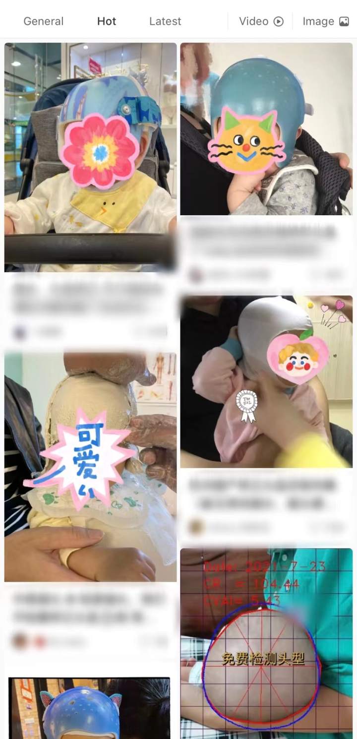 在社交軟件上輸入“矯形頭盔”,會跳出來許多寶媽們的使用分享。頭盔的型號、外觀五花八門,但原理大同小異,都是通過佩戴促進顱骨向標準方向的區(qū)域生長。