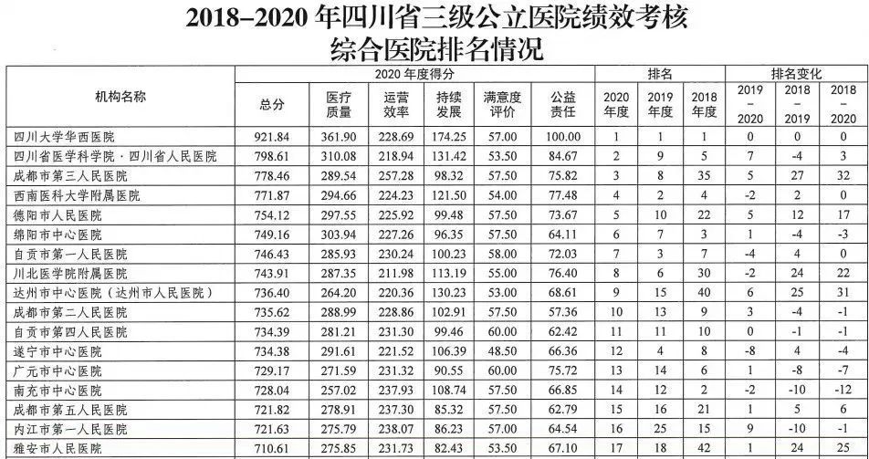 近日,四川省衛(wèi)健委公布了全省2020年度公立醫(yī)院績考核結(jié)果,資料顯示,此次全省有164家三級(jí)公立醫(yī)院參評(píng)。四川省三級(jí)公立醫(yī)院績考核工作于2019年啟動(dòng),主要由醫(yī)療質(zhì)量、運(yùn)營率、持續(xù)發(fā)展、滿意度評(píng)價(jià)和社會(huì)益5個(gè)方面構(gòu)成。值得一提的是,從今年的公開排名指標(biāo)來看,社會(huì)益被替換為了公益責(zé)任。