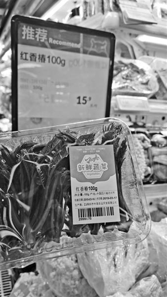 在家樂福江東店的蔬菜區(qū)域,記者看到香椿經(jīng)預(yù)選后分包出售,每份100多克。每公斤售價(jià)79.6元,分裝后每份售價(jià)10元上下。
