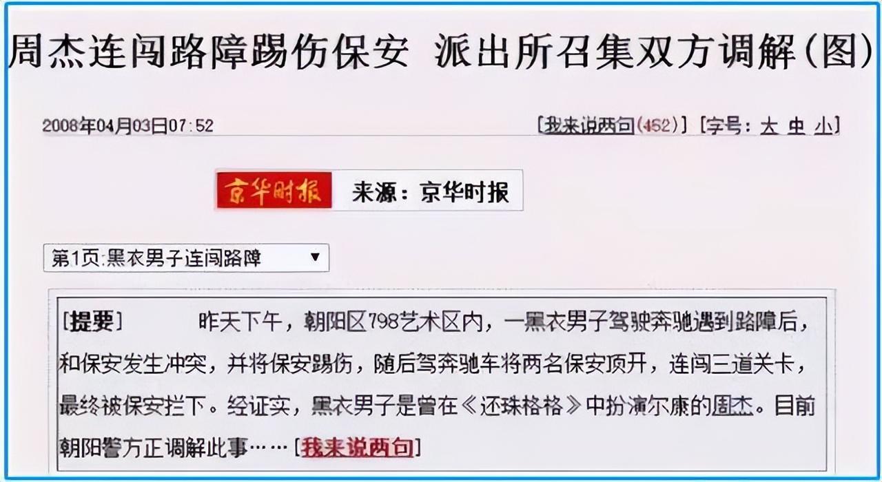 2008年,有媒體報道,周杰因為車輛通行問題,在朝陽區(qū)798藝術(shù)區(qū)內(nèi)與保安發(fā)生沖突,不僅打人,甚至直接開著奔馳車頂了,兩名保安。