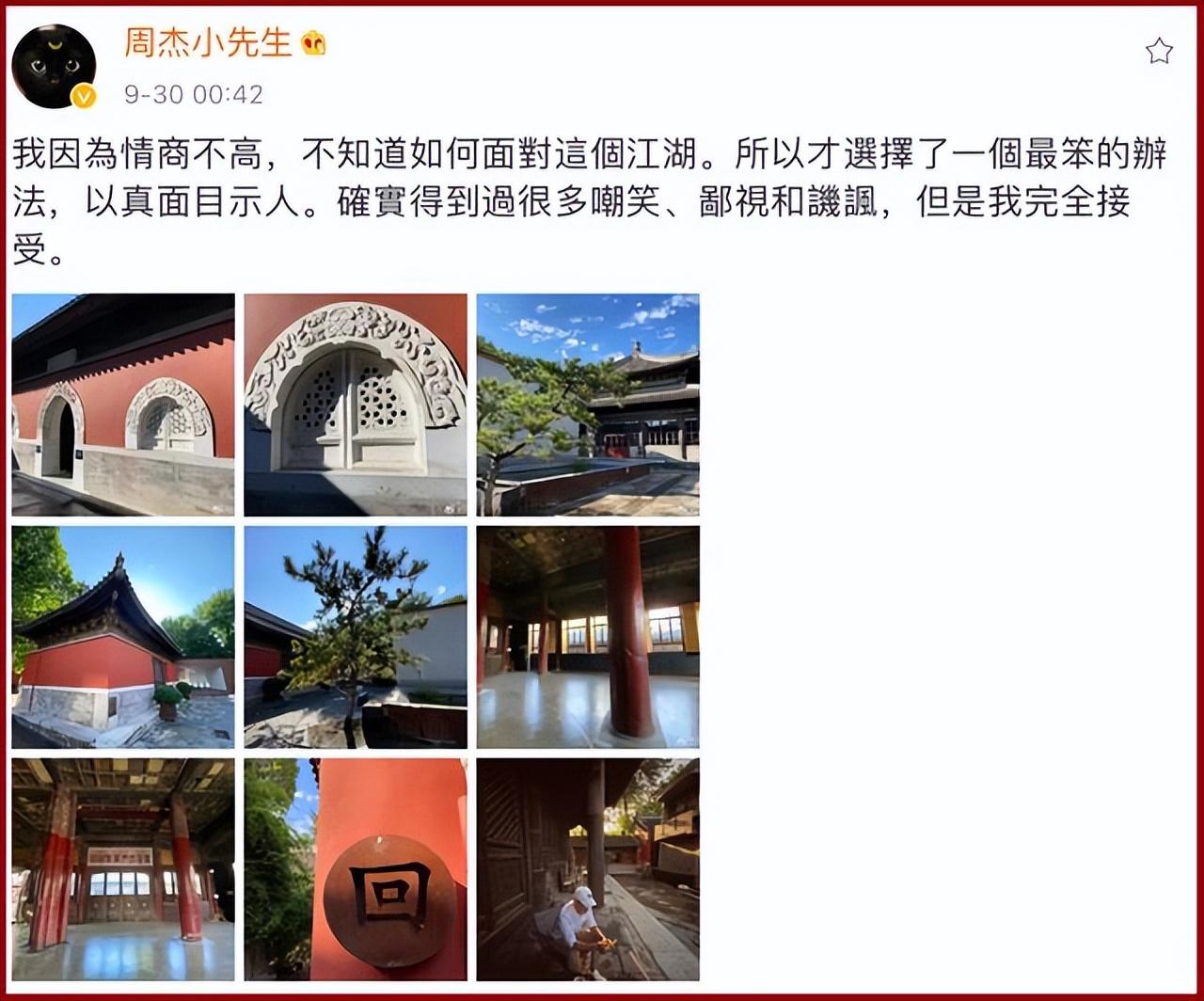 6、2020年9月30日深夜,周杰在社交媒體上發(fā)文:我因為情商不高,不知道如何面對這個江湖。所以才選擇了一個笨的辦法,以真面目示人。確實得到過許多嘲笑、鄙視和譏諷,但我完全接受。
