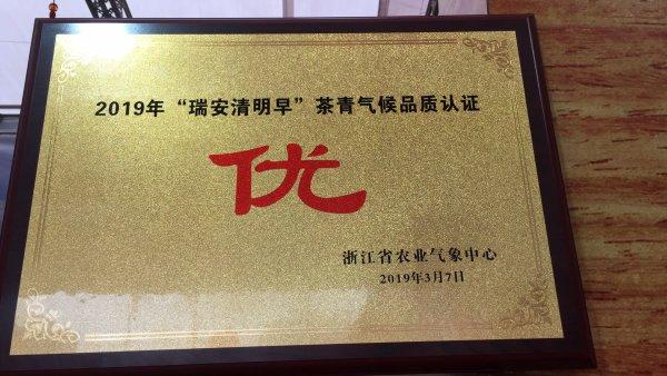 除了密切監(jiān)測天氣條件,2月份,氣象工作人員多次到高樓鎮(zhèn)的茶園勘查、取樣,協(xié)助合作社準備材料,向省農(nóng)業(yè)氣象中心申報農(nóng)產(chǎn)品氣候品質(zhì)認證。3月初,一場專門針對“瑞安清明早”的茶葉氣候品質(zhì)認證會議在杭州召開。浙江茶葉協(xié)會研究員、省農(nóng)技推廣中心研究員、省科技開發(fā)中心和省氣象臺的研究員、教授、高工一起,參與評審,終認定2019年3月瑞安市東甌清明早茶專業(yè)合作社聯(lián)合社生產(chǎn)的“瑞安清明早”茶青氣候品質(zhì)等級為“優(yōu)”。這是瑞安“清明早”茶葉第一次獲得氣候品質(zhì)的認證。