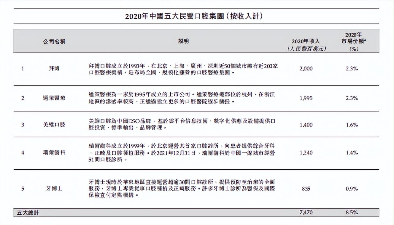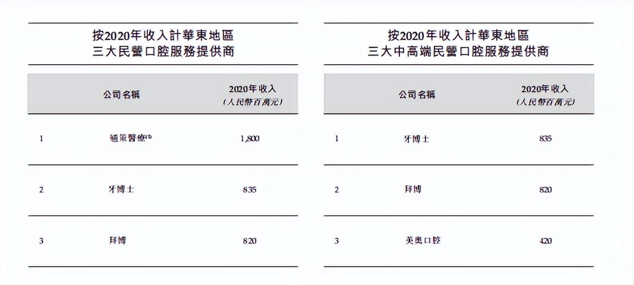 據(jù)招股書顯示,據(jù)2020年?duì)I收數(shù)據(jù),牙博士為第五大中國民營口腔集團(tuán),前四位分別為拜博、通策醫(yī)療、美維口腔和瑞爾齒科。其中,通策醫(yī)療與瑞爾已經(jīng)成功上市,拜博與美維也經(jīng)歷了多輪融資,可見民營口腔醫(yī)療機(jī)構(gòu)們都在向資本市場涌入。