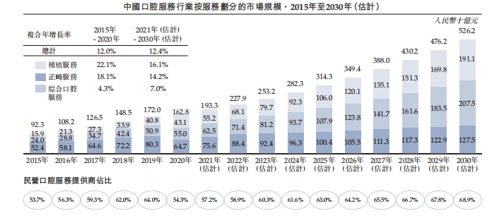 根據(jù)灼識咨詢報(bào)告,中國口腔服務(wù)行業(yè)的市場規(guī)模持續(xù)擴(kuò)大,由2015年約923億元增加至2020年的1628億元,年復(fù)合增長率為12%,并且預(yù)計(jì)到2030年將達(dá)約5262億元,年復(fù)合增長率達(dá)12.4%。