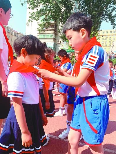 “六一”兒童節(jié)到來之際,山東煙臺(tái)芝罘區(qū)南通路小學(xué)舉行少先隊(duì)員入隊(duì)儀式。柳洪濤攝/光明圖片