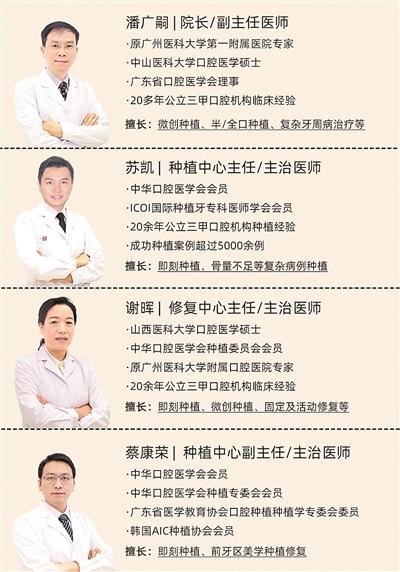 在口腔醫(yī)療機(jī)構(gòu)里,一名患者通常由一名主治醫(yī)師負(fù)責(zé),往往會(huì)出現(xiàn)傳統(tǒng)種植方案設(shè)計(jì)無法滿足患者需求或因醫(yī)生經(jīng)驗(yàn)不足無法進(jìn)行種植等問題。廣州暨博口腔 “疑難種牙特診小組”聚集了多名有三甲醫(yī)院口腔科工作經(jīng)驗(yàn)的名醫(yī),潘廣嗣院長(zhǎng)、蘇凱主任、謝暉主任等臨床經(jīng)驗(yàn)均在20年以上、種牙超過10000顆,在數(shù)字化種植、疑難復(fù)雜種植方面經(jīng)驗(yàn)豐富,專業(yè)為每一位患者提供每一顆牙的病例討論,嚴(yán)把質(zhì)量關(guān)。