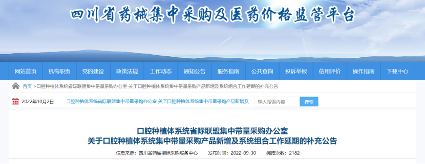 口腔耗材集采,延伸至「正畸」領(lǐng)域9月30日,四川省藥械集中采購平臺發(fā)布《口腔種植體系統(tǒng)省際聯(lián)盟集中帶量采購辦公室關(guān)于口腔種植體系統(tǒng)集中帶量采購產(chǎn)品新增及系統(tǒng)組合工作延期的補充公告》,再次開展基礎(chǔ)信息增補工作。