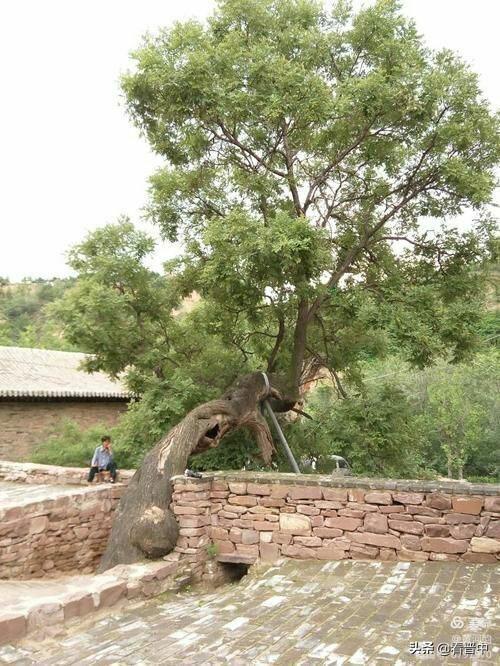 走過(guò)龍門(mén)石橋便步入村中石徑。石徑彎道口兩株古槐夾道相迎。左側(cè)一株已空心,憑著僅存的樹(shù)壁掙扎、扭曲、偃仰著朝路口盤(pán)升,在路口的上方又撐開(kāi)綠意盎然的樹(shù)冠。村人怕旺密的樹(shù)冠折斷而用棍支撐;右側(cè)一槐更為古老,粗壯的樹(shù)干需三人合抱,據(jù)說(shuō)有一千二百年樹(shù)齡。這株老樹(shù)也有大段的枯木和大片的郁郁蔥蔥的新枝,下也用棍支撐。兩株老樹(shù)像兩位拄著拐杖返老還童的老人。兩樹(shù)相對(duì)、古道槐蔭、挺立千年,不知迎送了多少南來(lái)北往之人。