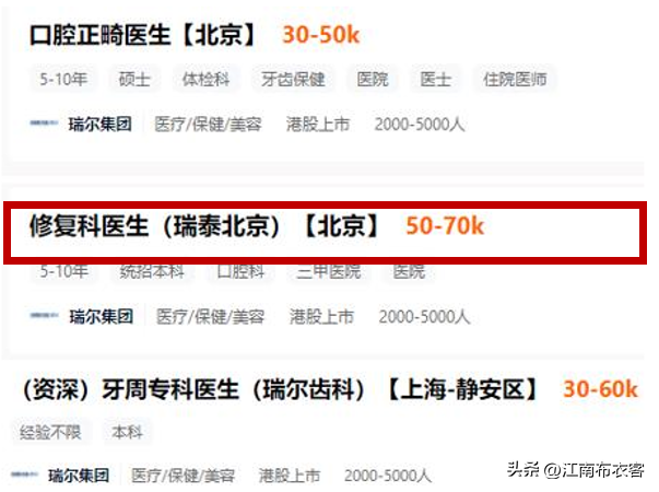 私立牙科醫(yī)療上市公司瑞爾集團2021年財報顯示:平均每名全職牙醫(yī)能夠為公司帶來187.48萬元的收入,平均每名全職牙醫(yī)的年薪72.38萬元。在其招聘網(wǎng)站上招收的牙醫(yī)月薪均在3萬以上。甚至有其醫(yī)院口腔修復主任醫(yī)生黃建生則在微博上表示:瑞爾薪資高有年薪600~700萬