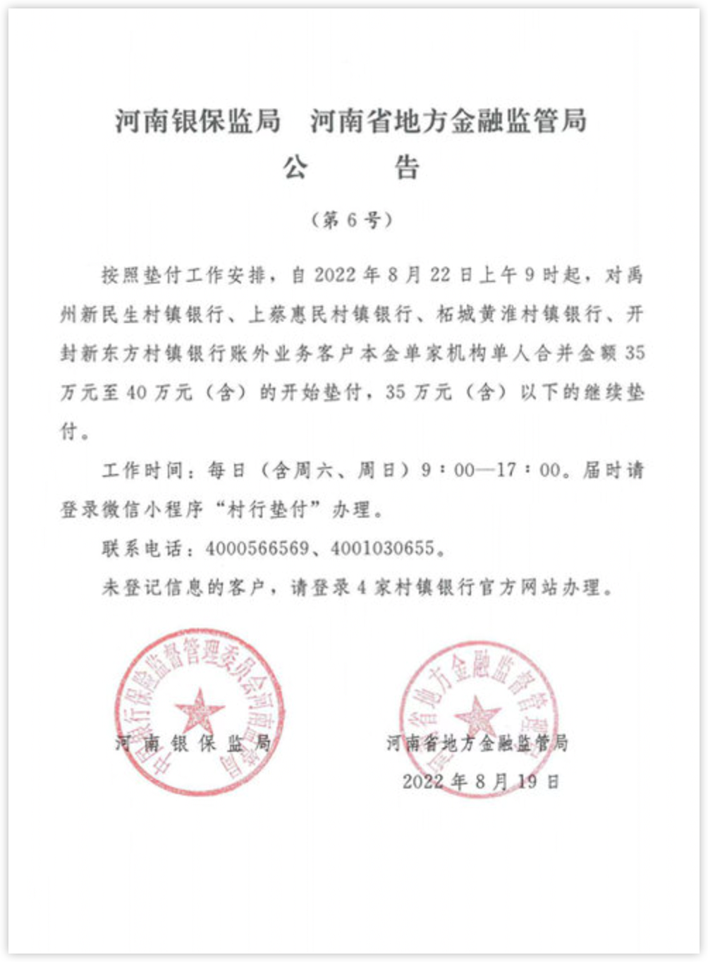 6.河南對(duì)村鎮(zhèn)銀行35萬至40萬客戶開始?jí)|付:19日,河南銀保監(jiān)局、河南省地方金融監(jiān)管局發(fā)布公告,按照墊付工作安排,自8月22日9時(shí)起,對(duì)禹州新民生村鎮(zhèn)銀行、上蔡惠民村鎮(zhèn)銀行、柘城黃淮村鎮(zhèn)銀行、開封新東方村鎮(zhèn)銀行賬外業(yè)務(wù)客戶本金單家機(jī)構(gòu)單人合并金額35萬元至40萬元(含)的開始?jí)|付,35萬元(含)以下的繼續(xù)墊付。(光明網(wǎng))
