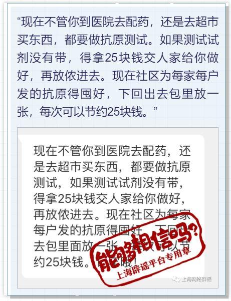 該提醒稱:“現(xiàn)在不管你到醫(yī)院去配藥,還是去超市買東西,都要做抗原測試。如果測試試劑沒有帶,得拿25塊錢交人家給你做好,再放儂進去。現(xiàn)在社區(qū)為每家每戶發(fā)的抗原得囤好,下回出去包里放一張,每次可以節(jié)約25塊錢。”