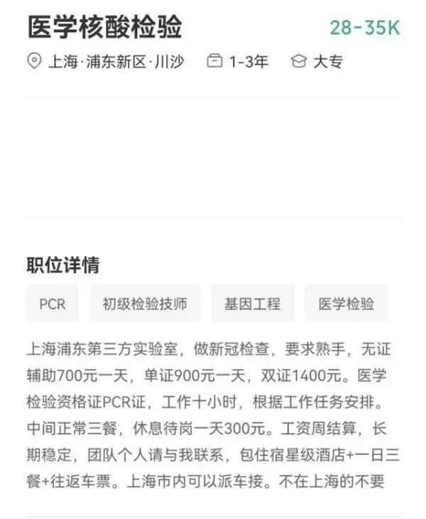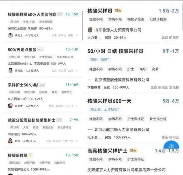 還有部分機構(gòu)招聘時,也提供短期兼職崗位。公開信息顯示,核酸采樣員如果以日薪結(jié)算,每天400、500和600元三個"尺碼"。