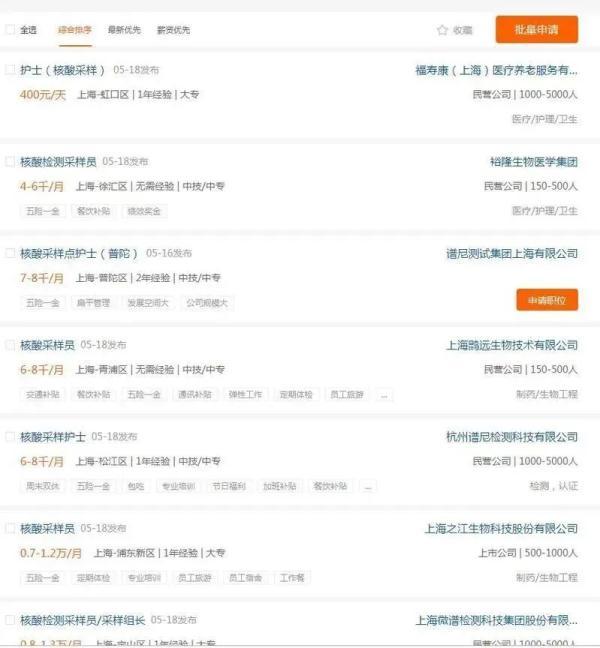 近期隨著檢測量激增,大量招聘核酸采檢人員的主要來自第三方公司。上海也不例外,在招聘網(wǎng)站發(fā)布崗位的用人單位,無一例外都是第三方社會檢測機構(gòu)。