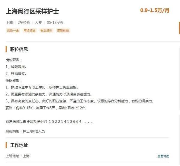 記者仔細梳理招聘信息,核酸采樣員崗位月薪開價高為1.5萬元,工作地點分別位于閔行、松江和浦東周浦,月薪開價低是4000至6000元,但特別注明這只是底薪,還包括績獎勵,并在漕河涇開發(fā)區(qū)內(nèi)閉環(huán)管理,包吃包住。這些核酸采樣員崗位,要求全職工作。