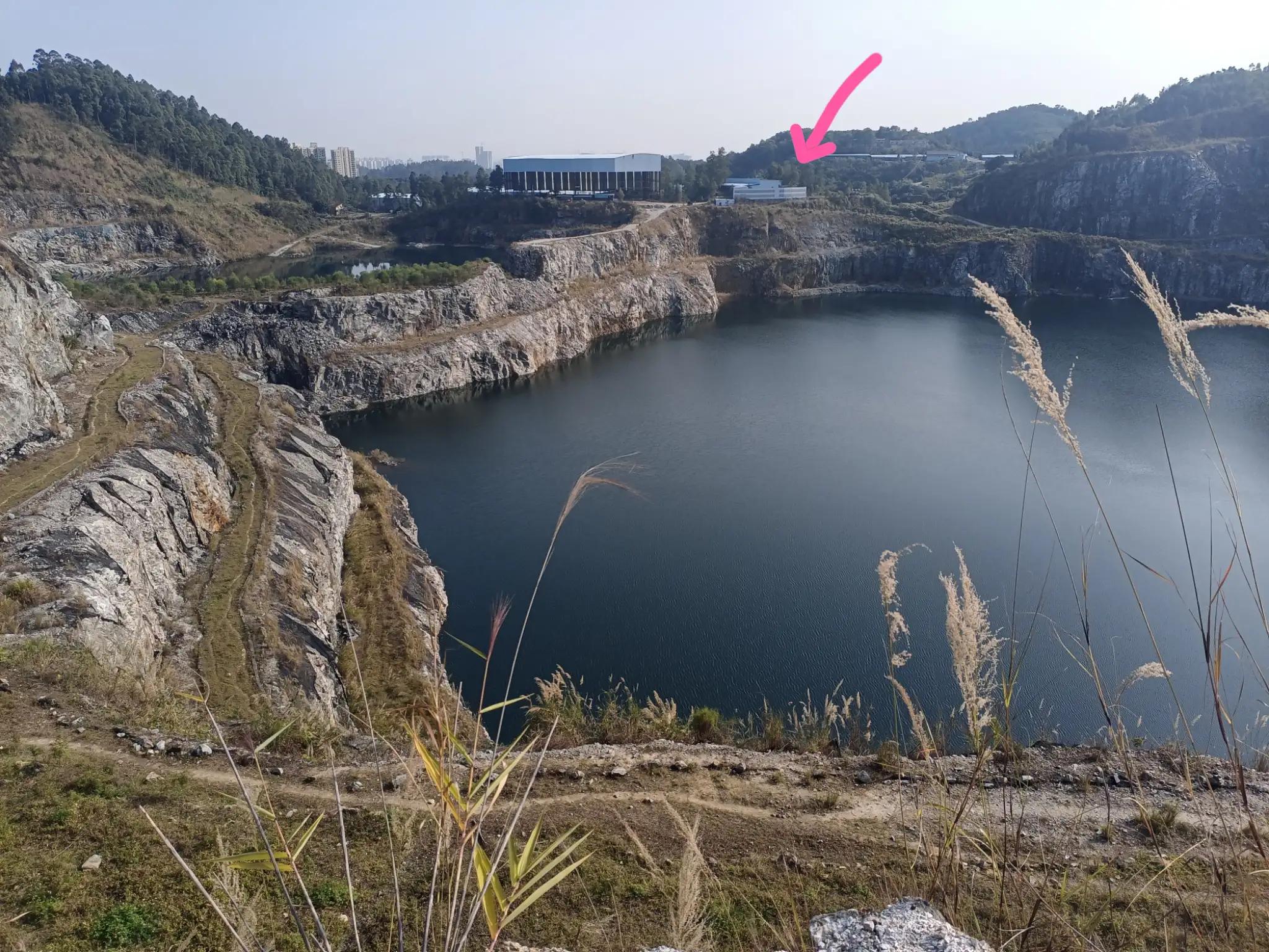 天坑是由采石場采過之后留下的兩個坑,東南的大些,西北的小些,現在還留有廢棄的場房,還有宿舍,以前去我和我朋友到那宿舍里面進去過,宿舍里面還留有2017年的日歷,想來那時還在開采。箭頭所指為廢棄場房,場房那邊現在應該是不讓去了,場房那邊是屬于增城區(qū)永寧街道,從那里出去有一條馬路,是可以開車進來的,但是會有保安看管,應該是不讓進的。