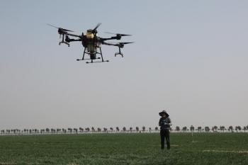 伴隨旋翼的嗡鳴聲,10架植保無(wú)人機(jī)低空掠過(guò),霧化后的藥物均勻地落在青青的麥苗上。