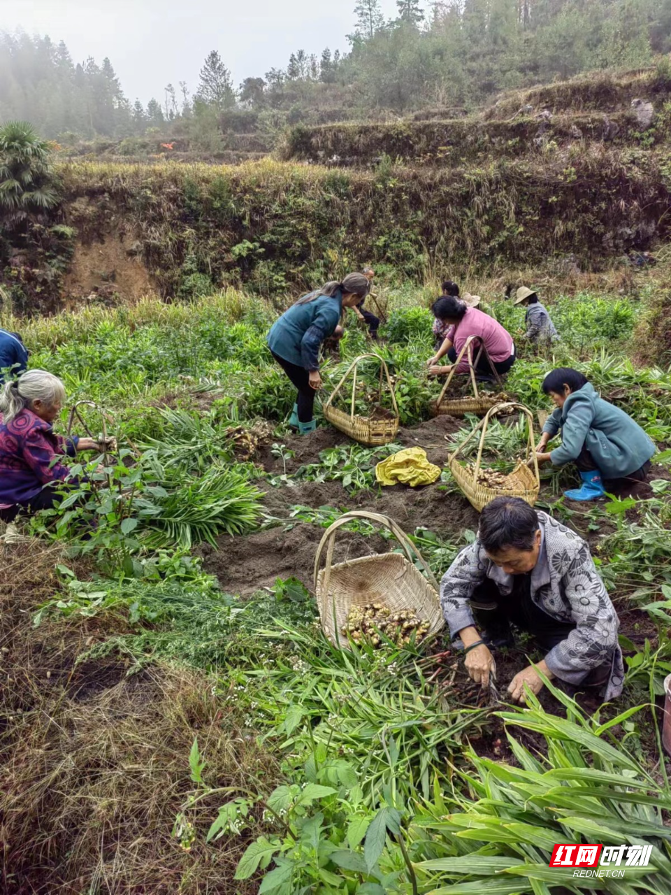 仰天湖瑤族鄉(xiāng)瑞金村小黃姜種植基地里村民們正在采小黃姜。