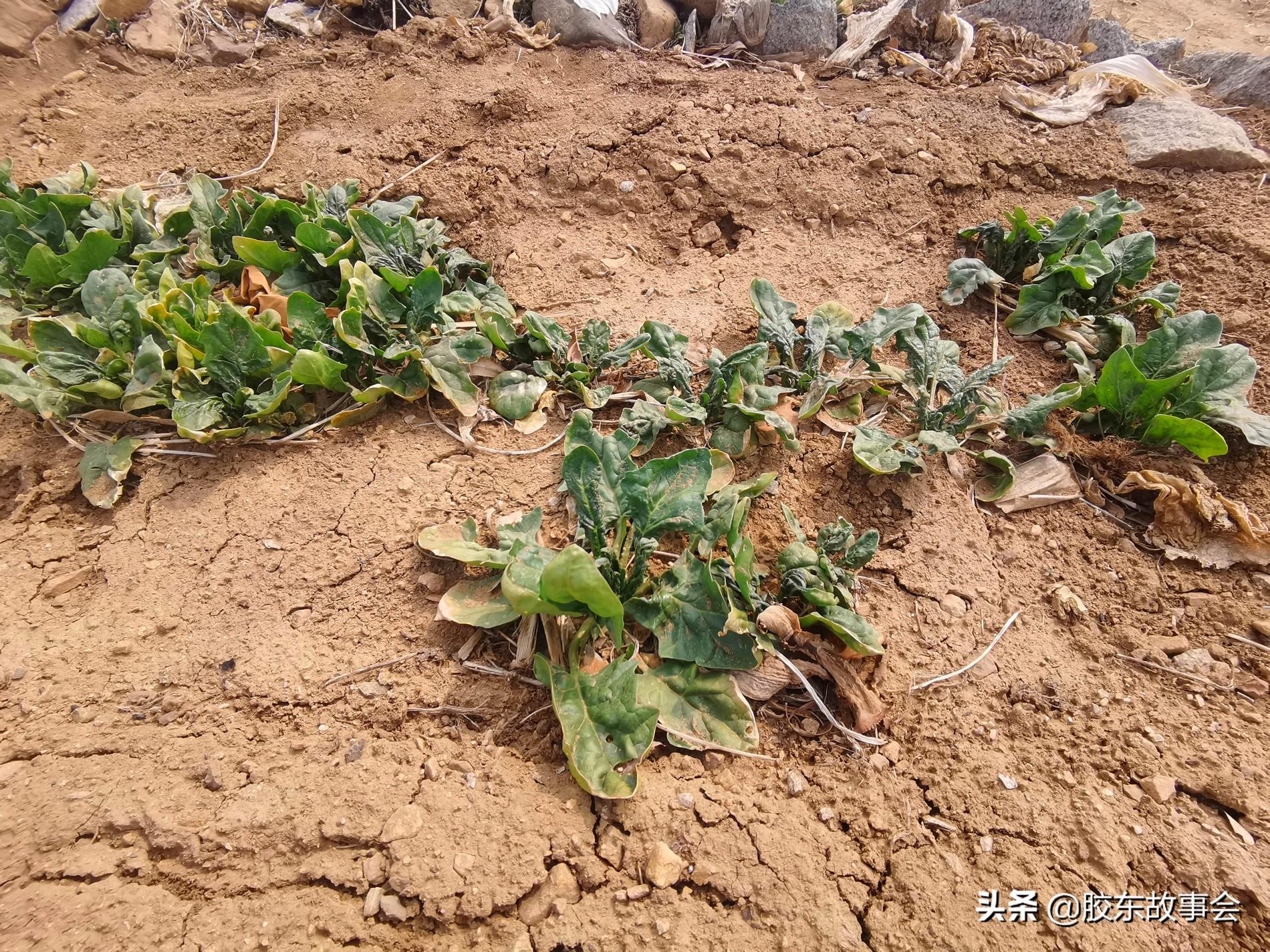 現(xiàn)在的菜園里,主色調(diào)還是以剛剛看到的新翻泥土的棕色為主。要尋找綠意,需要彎下腰來仔細(xì)看才行。圖中看到的是越冬之后的紅根菠菜,它們還沒有完全“蘇醒”,有些葉子還是發(fā)黃。