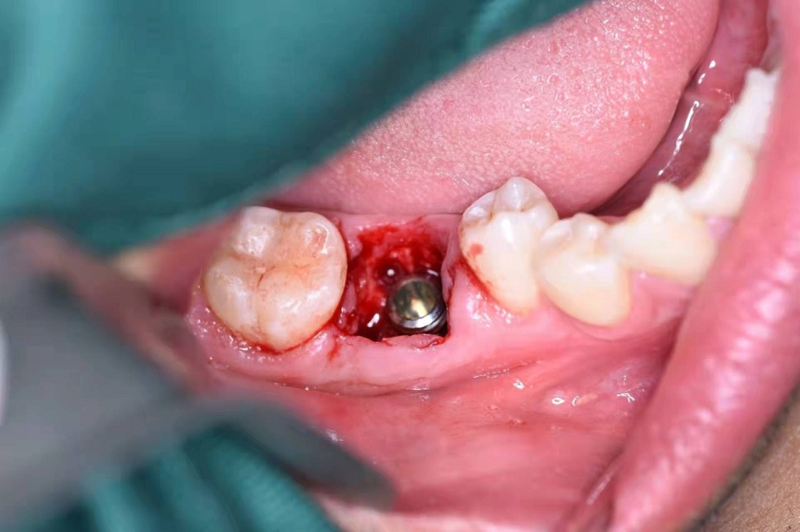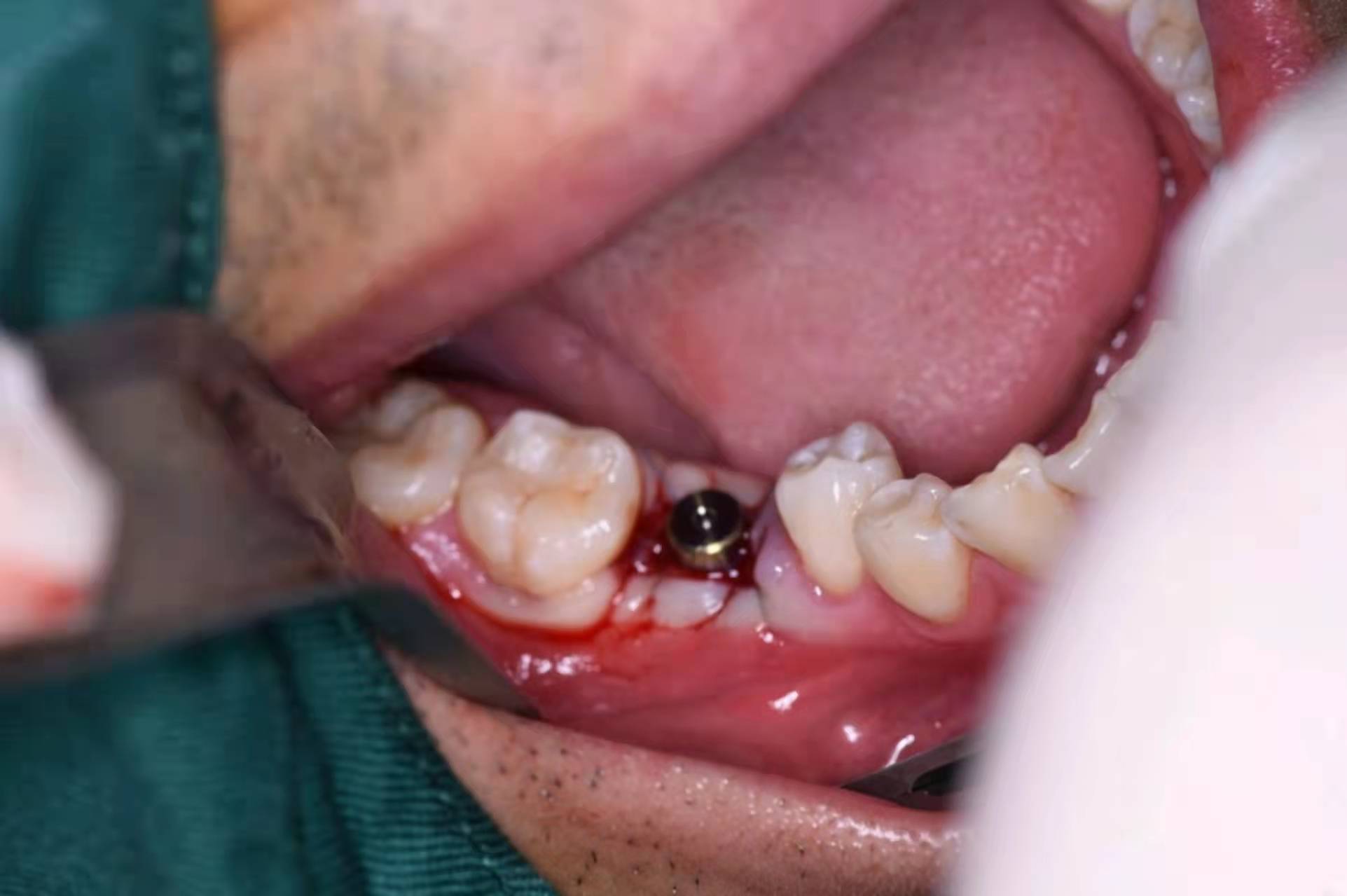 將牙齦切開一個小口,翻開之后,在暴露的牙骨上,將種植體旋入到牙槽窩內(nèi)。