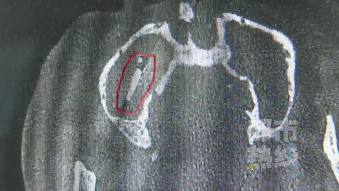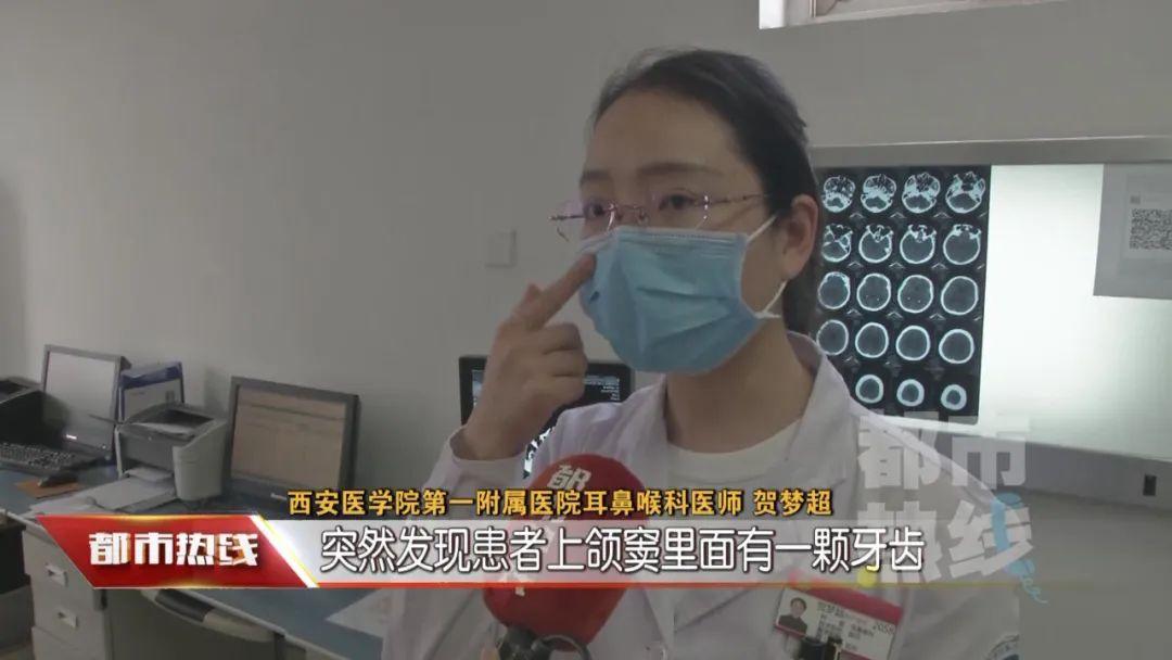 西安醫(yī)學(xué)院第一附屬醫(yī)院耳鼻喉科醫(yī)師賀夢(mèng)超:“一星期前,患者因流鼻涕、打噴嚏等癥狀來(lái)就醫(yī) ,在我們經(jīng)過(guò)仔細(xì)檢查后發(fā)現(xiàn),患者右側(cè)上頜竇里竟然有種植牙的牙根殘端 ?!?/p>
