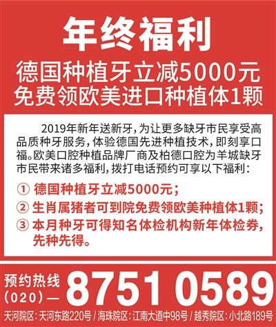 由歐美各大口腔種植品牌廠商聯(lián)合柏德口腔共同發(fā)起的“千人種牙團(tuán)購(gòu)會(huì)”活動(dòng)在羊城火熱進(jìn)行中。據(jù)悉,團(tuán)購(gòu)會(huì)齊聚數(shù)十位國(guó)際口腔醫(yī)學(xué)博士,為羊城缺牙市民帶來(lái)德國(guó)種植技術(shù)——當(dāng)天種當(dāng)天用,受到缺牙市民的好評(píng)。為了惠及更多缺牙市民,2019年新年期間,“千人種牙團(tuán)購(gòu)會(huì)第3期”盛大開(kāi)啟。屆時(shí)中德院長(zhǎng)將現(xiàn)身為缺牙市民解答疑惑,歐美各大口腔種植品牌廠商新年送福利。撥打電話020-8751 0589免費(fèi)領(lǐng)萬(wàn)元福袋,更有德國(guó)種植牙代金券5000元。