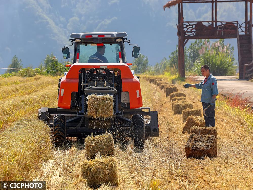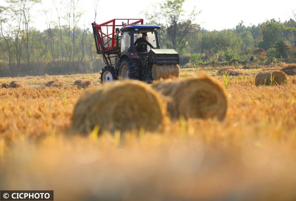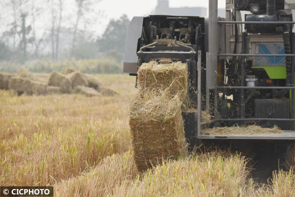 ↑2022年11月7日,在湖南省永州市道縣祥霖鋪鎮(zhèn)胡家村,農(nóng)民駕駛秸稈打捆機(jī)進(jìn)行水稻秸稈打捆作業(yè)。CICPHOTO/何紅福 攝