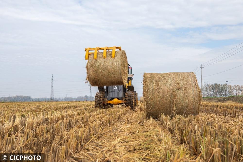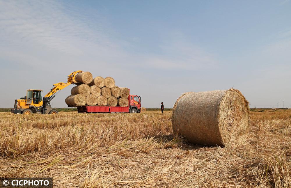 ↑2022年11月6日,在安徽省安慶市宿松縣華陽河農(nóng)場,農(nóng)民將打捆的水稻秸稈裝車。CICPHOTO/李龍 攝
