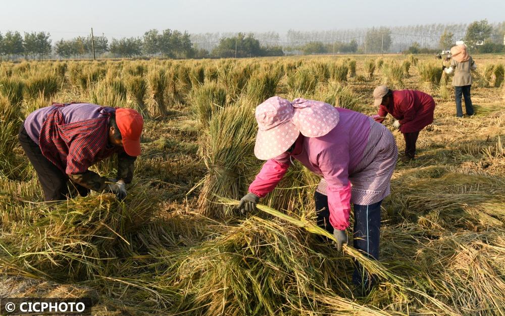 ↑2022年11月6日,在江蘇省淮安市洪澤區(qū)東雙溝鎮(zhèn)張莊村,一草簾加工企業(yè)的工人在稻田里捆扎秸稈。CICPHOTO/劉彬 攝