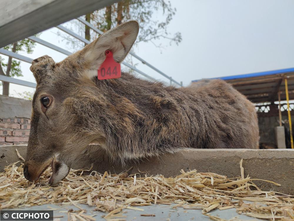 ↑2022年11月4日,在湖北省孝感市云夢縣清明河鄉(xiāng)紅星村梅花鹿養(yǎng)殖基地,一只梅花鹿在食用秸稈飼料。CICPHOTO/陳保忠 攝