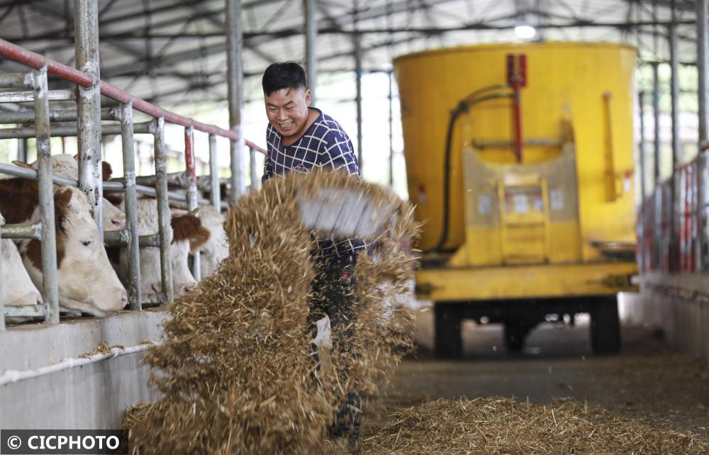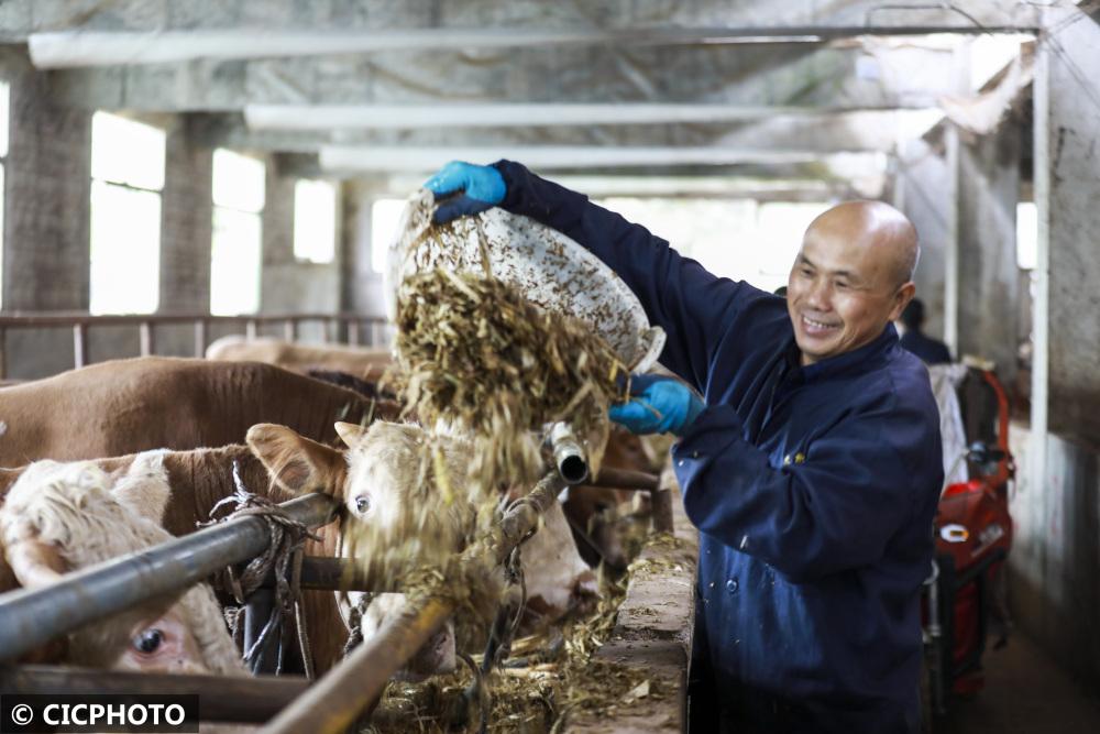 ↑2022年10月14日,在貴州省黔西市雨朵鎮(zhèn)蒿枝村生態(tài)養(yǎng)牛場,農(nóng)民用秸稈飼料給牛喂食。CICPHOTO/周訓(xùn)超 攝