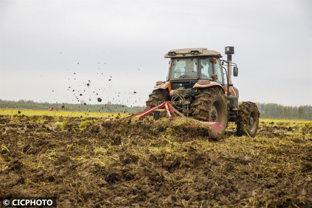 ↑2022年10月26日,在江蘇省連云港市東??h平明鎮(zhèn)一處高標(biāo)準(zhǔn)農(nóng)田,農(nóng)民駕駛農(nóng)機(jī)將水稻秸稈犁耕深翻還田作業(yè)后的土壤整平。CICPHOTO/柴軍委 攝