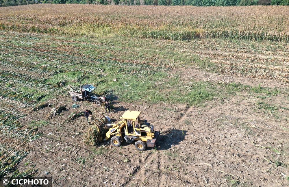 ↑2022年10月12日,在江蘇省淮安市洪澤區(qū)東雙溝鎮(zhèn)一處玉米地,一家養(yǎng)殖企業(yè)的工人在裝運(yùn)玉米秸稈,準(zhǔn)備用于加工青儲飼料喂羊。(無人機(jī)照片)CICPHOTO/劉彬 攝